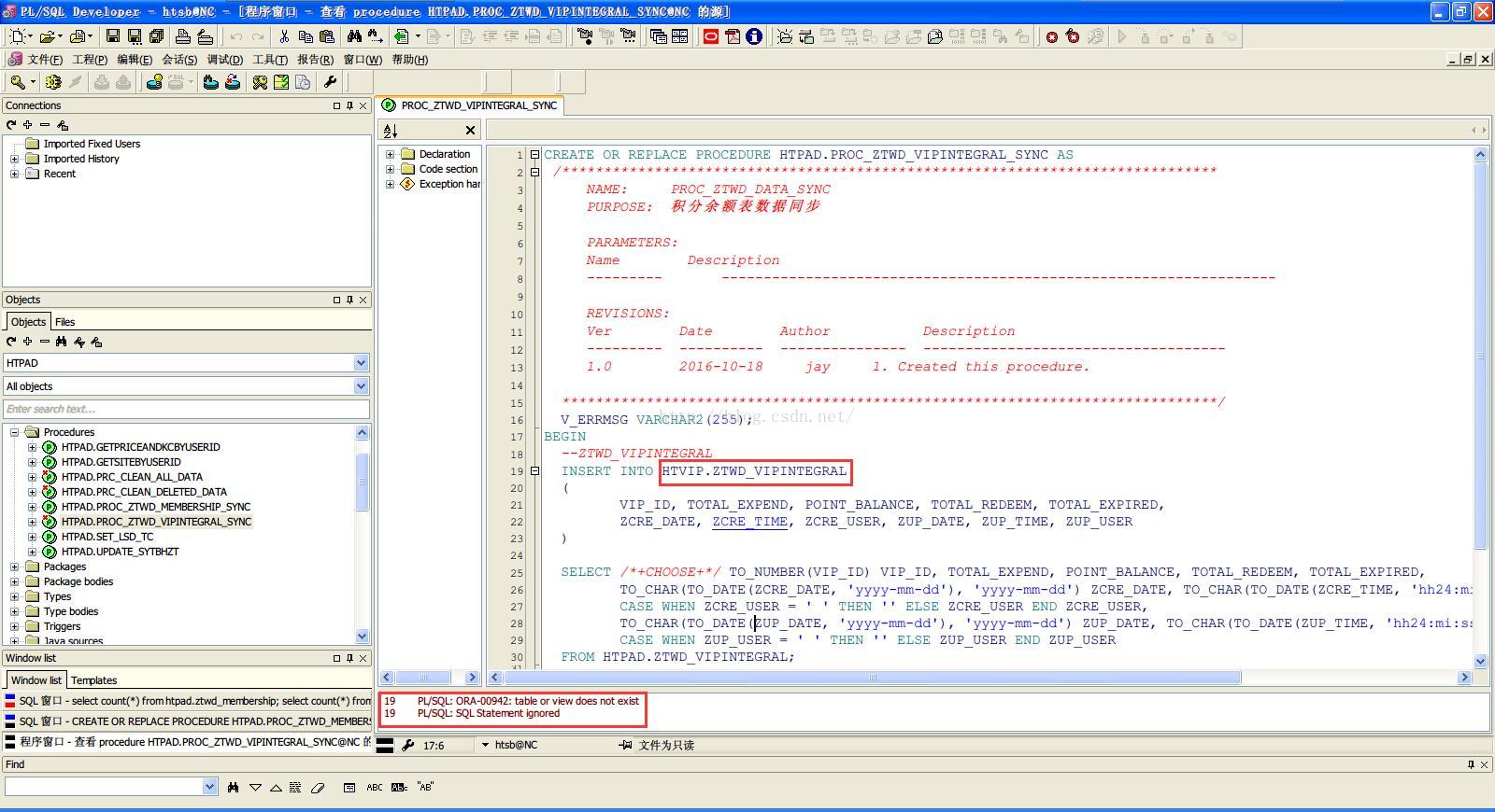 原因是当前用户没有HTVIP.ZTWD_VIPINTEGRAL表的插入权限导致的,如果A用户在存储过程中调用B用户的对象,则必须B显示的把该对象的相应权限赋予给用户A。