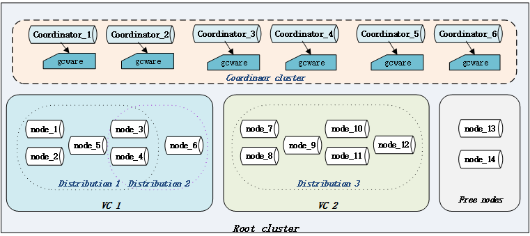GBase 8a MPP Cluster的虚拟集群技术支持对集群数据库按照不同的业务划分为多个逻辑子集群,并在统一的协调节点下对各个逻辑子集群进行统一管理和操作,实现跨逻辑子集群的数据关联和数据交换。如下图所示: