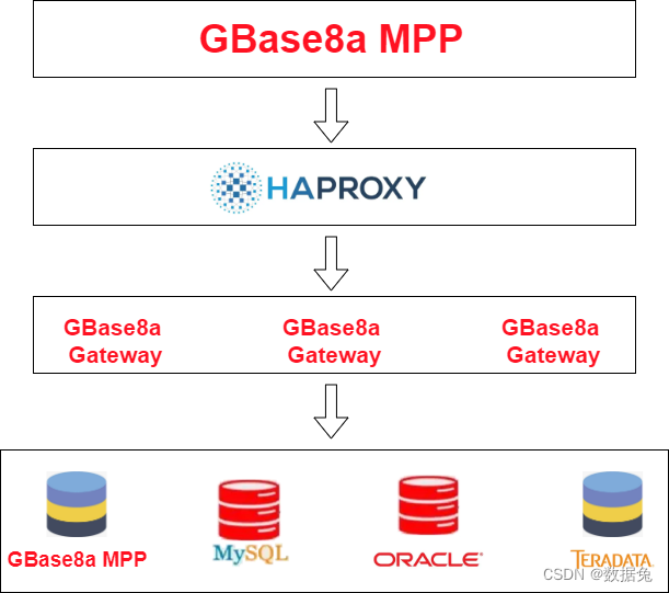 GBase8a MPP启用DB-Link后,其配置的透明网关地址,并不是单个的Gateway地址,而是配置到HAProxy这个代理地址上,所有的请求由HAProxy进行负载转发,根据配置的代理规则路由到不同的Gateway中。