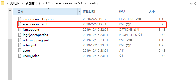 5.修改es使用的参数.编辑F:ESelasticsearch-7.5.1configelasticsearch.yml文件
