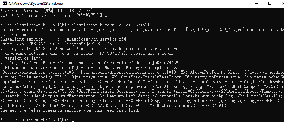 2.cmd 进入bin目录下执行: elasticsearch-service.bat install