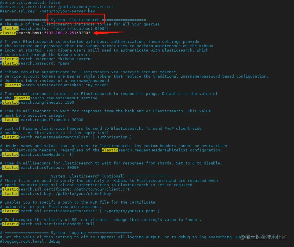 去掉多行配置前面的‘#’,然后执行 grep -Ev "^#" /etc/kibana/kibana.yml