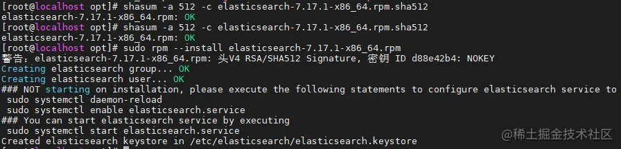 [root@localhost opt]# shasum -a 512 -c elasticsearch-7.17.1-x86_64.rpm.sha512