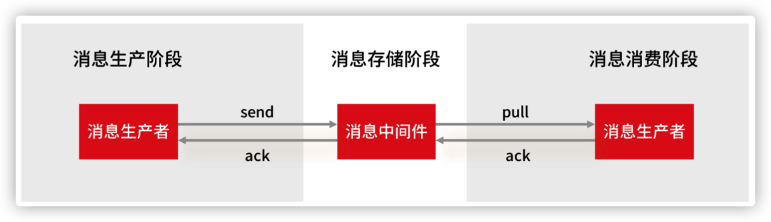 我们首先来看消息丢失的环节,一条消息从生产到消费完成这个过程,可以划分三个阶段,分别为消息生产阶段,消息存储阶段和消息消费阶段。
