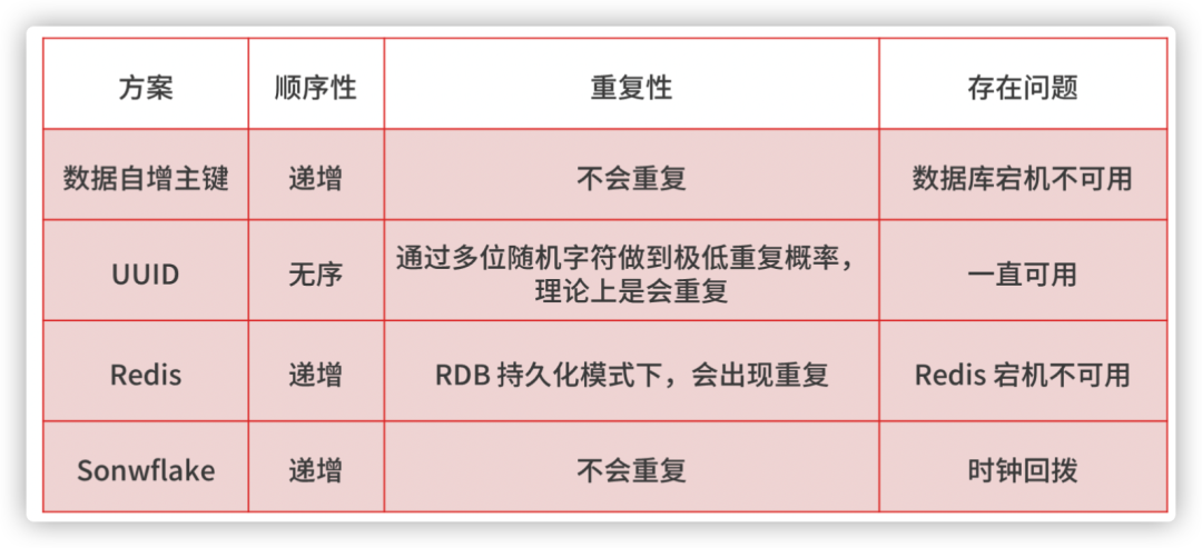 在分布式系统中,全局唯一 ID 生成的实现方法有数据库自增主键、UUID、Redis,Twitter-Snowflake 算法,我总结了几种方案的特点,你可以参考下。