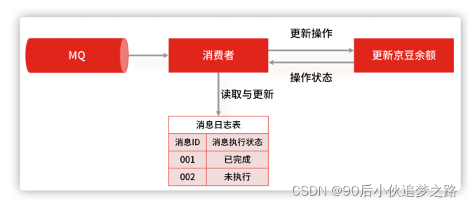 最简单的实现方案,就是在数据库中建一张消息日志表 , 这个表有两个字段:消息 ID 和消息执行状态。这样,我们消费消息的逻辑可以变为:在消息日志表中增加一条消息记录,然后再根据消息记录,异步操作更新用户京豆余额。