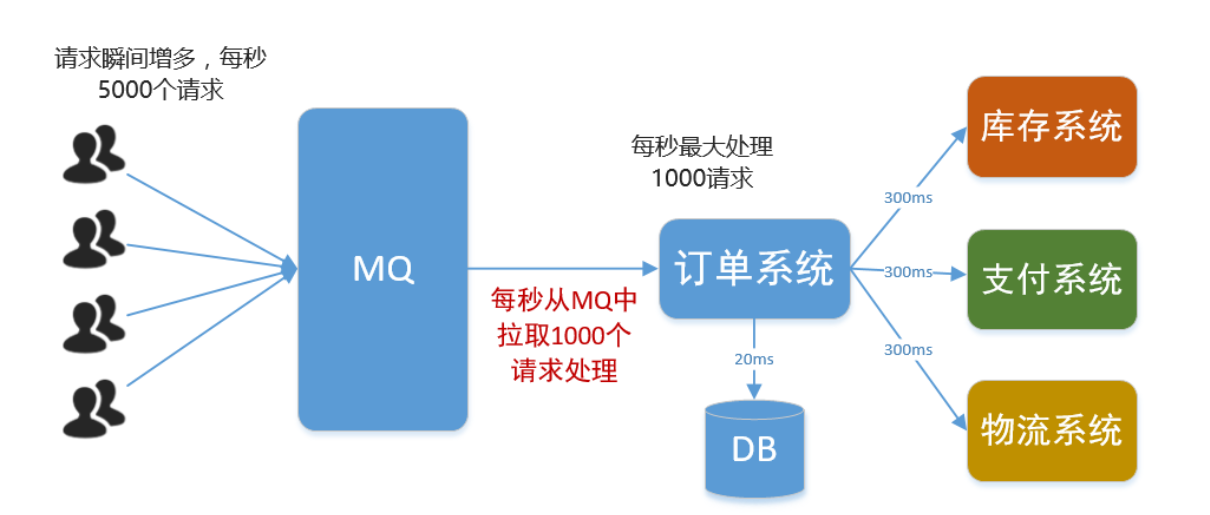 当系统峰值比较高的时候 , 我们我们可以使用RabbitMQ实现削峰填谷, 让我们系统处理的请求更加平稳
