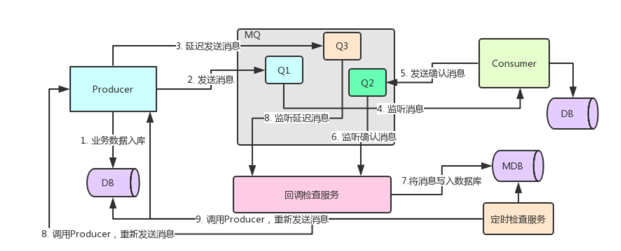 消息补偿机制需要建立在业务数据库和MQ数据库的基础之上 , 当我们发送消息时 , 需要同时将消息数据保存在数据库中, 两者的状态必须记录。 然后通过业务数据库和MQ数据库的对比检查消费是否成功,不成功,进行消息补偿措施,重新发送消息处理