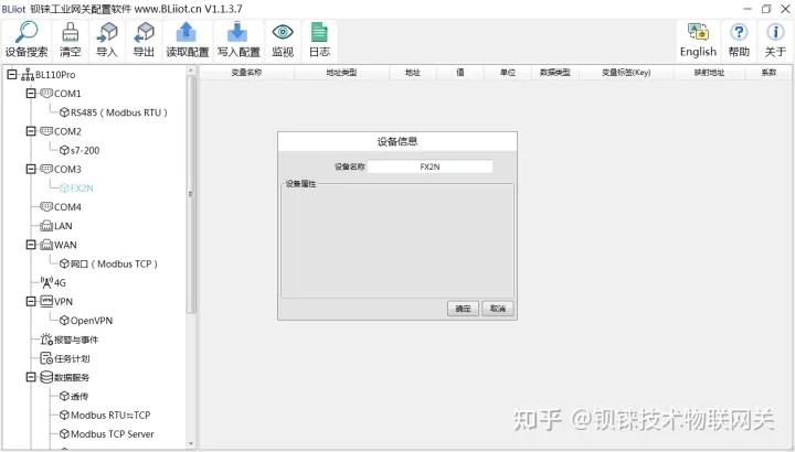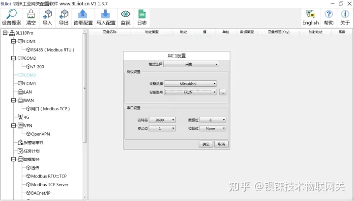 工业智能网关BL110 采集 三菱 PLC FX2N 接入Modbus TCP Server云平台