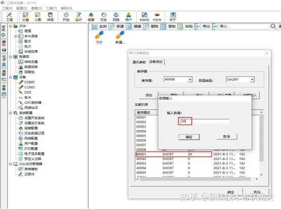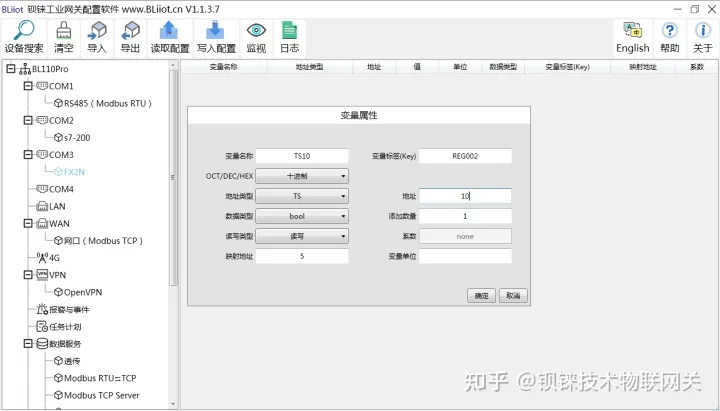 (1)点击“ 三菱 PLC FX2N ”,鼠标光标移动到方框内,鼠标右键,点击“添加”弹出数据点设置框。(2)变量名称:命名数据点的名字,如:采集“TS10”的数据,可以填写为:TS10。(3)变量单位:根据需求任意填写,可以不填写。(4)地址类型:根据采集的PLC的数据点选择。如:要采集“TS10”的数据则选择“TS”。(5)起始地址:采集数据点的寄存器地址,如:采集“TS10”的数据,地址为:10。(6)数据类型:根据选择采集PLC的寄存器的类型选择。(7)添加数量:如果是采集连续地址,同一寄存器可以多个采集。(8)读写类型:从“只读”、“可读可写”中选择。(9)系数:扩大或缩小多少倍上传给平台,根据需求填写。(10)modbus映射地址:填写采集到的数据点存储到BL110网关设备的地址,可以随意填写。映射地址不能重复。范围:0-2000。如:采集“TS10”的映射地址为“10”。(11)数据点的MQTT标识符,可以任意填写。标识符不能重复,如:采集“TS10”数据点的MQTT标识填写为“TS10”。(12)点击“确定”。