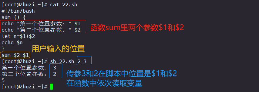 在Shell中,调用函数时可以向其传递参数。在函数体内部,通过 $n 的形式来获取参数的值,例如,$1表示第一个参数,$2表示第二个参数…即使用位置参数来实现参数传递。