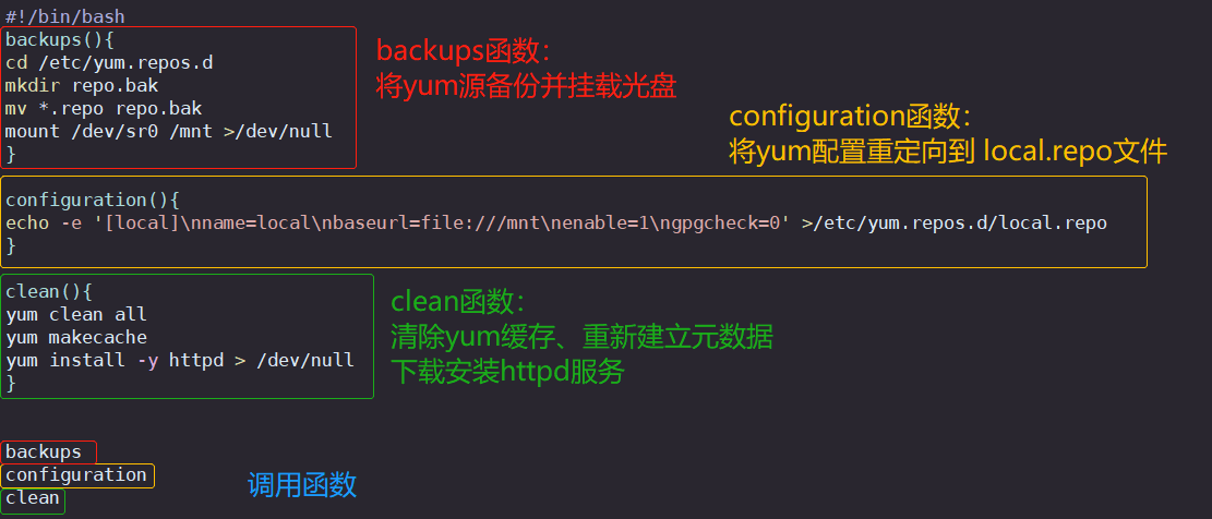 示例脚本2: 函数备份yum线上源,创建yum本地源和清理缓存安装httpd