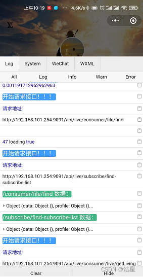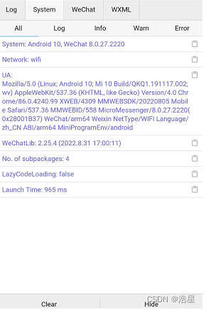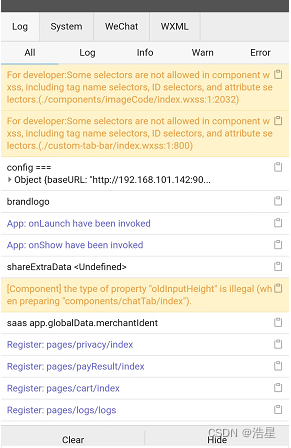 点击 vConsole,可以看到console.log的信息,注意,这里没办法像我们的开发者工具或者pc一样,打开所有的工具,这里只有小程序默认支持的 Log(console.log), WXML(界面元素)等等