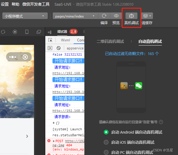 点击开发调试,需要重新进入小程序,进入以后,可以看到