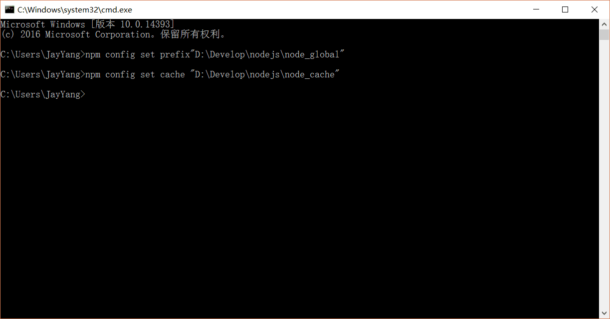 说明:这里的环境配置主要配置的是npm安装的全局模块所在的路径,以及缓存cache的路径,之所以要配置,是因为以后在执行类似:npm install express [-g] (后面的可选参数-g,g代表global全局安装的意思)的安装语句时,会将安装的模块安装到【C:Users用户名AppDataRoamingnpm】路径中,占C盘空间。