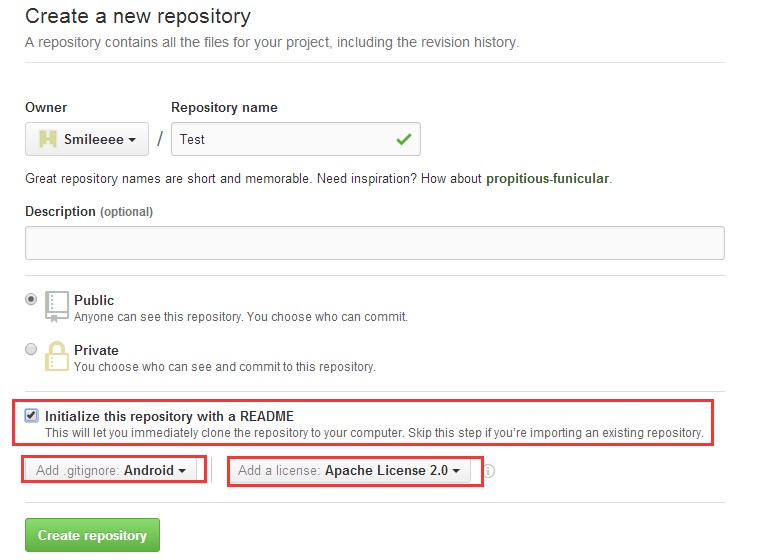 点击New repository,创建新的仓库,就注意一下那些选项就好: