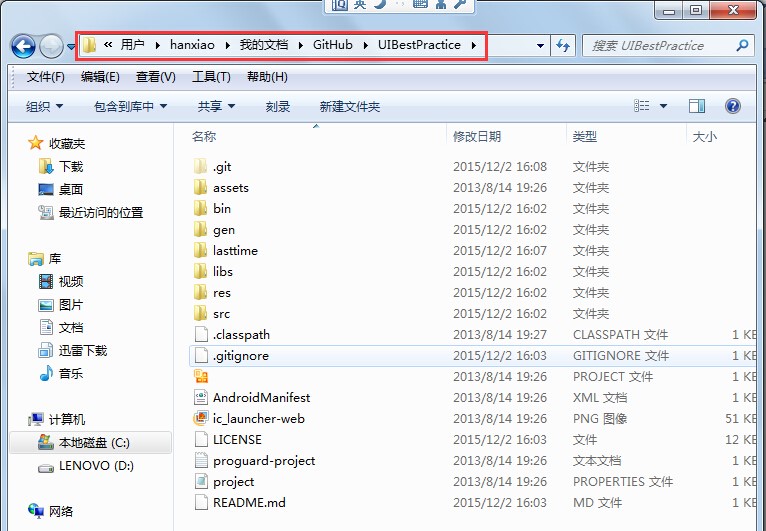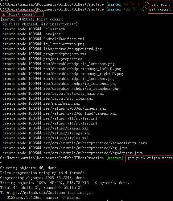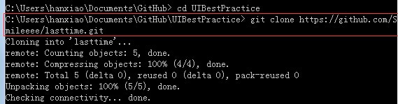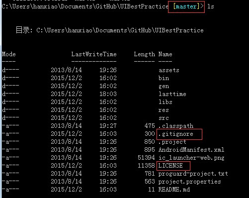 然后打开电脑上的Git Bash,并切换到你的项目的目录下,这里假设我的项目名称为 UIBestPractice ,其实放哪里都可以啦,因为之后只要拷贝过来就可以啦:
