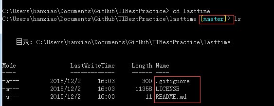 用ls -al 就可以查看到 .git 这个隐藏文件了。发现了吗?此时我们的UIBestPractice文件夹已经有了 [master] 的标识了。这个时候就可以把lasttime这个文件夹删掉了。