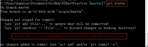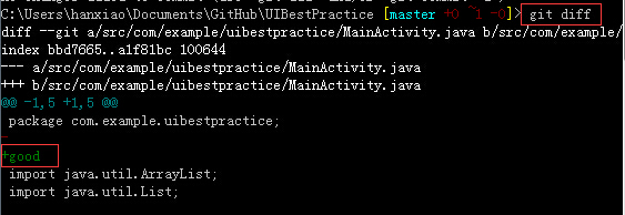 假设我现在在MainActivity.java文件中修改了一点点内容,添加了一个“good”进去并保存,然后通过指令就可以显示出你发生变化的那个文件: