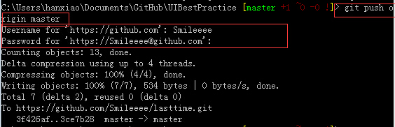 然后再push:这次总算问我要了用户名和密码:密码不可见的,直接输入就好