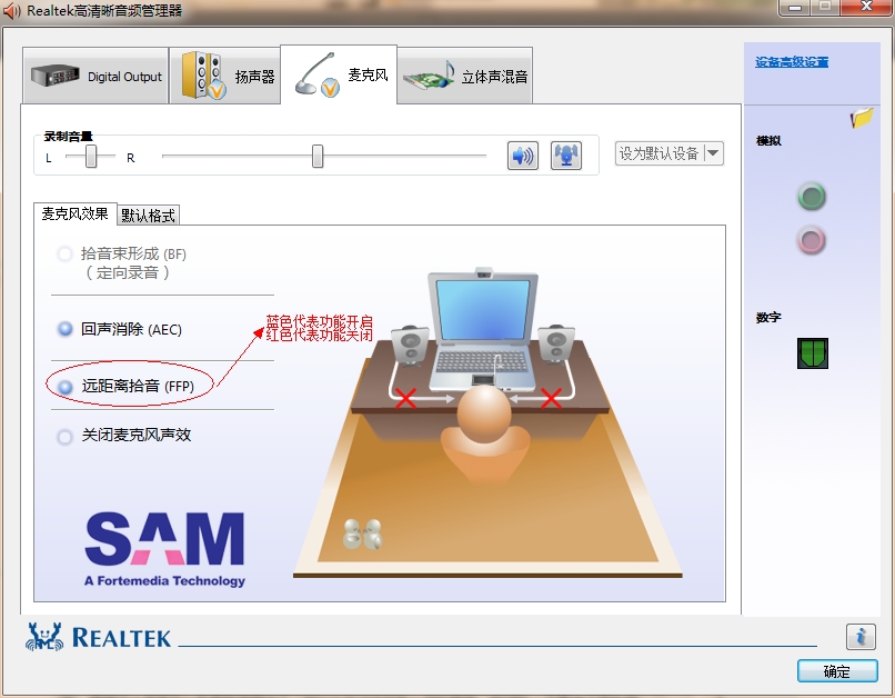 注1:"远距离拾音(FFP)"功能的作用是从距离笔记本麦克风稍远的位置收集声音,此功能开启后因使用环境的声音也会一同拾取,多数的使用环境嘈杂的声音会比较多,所以会出现所谓的“杂音”现象;此功能关闭后,因笔记本麦克风拾取声音范围减小,所以不会过多拾取外部的声音,即消除了“杂音”的影响。