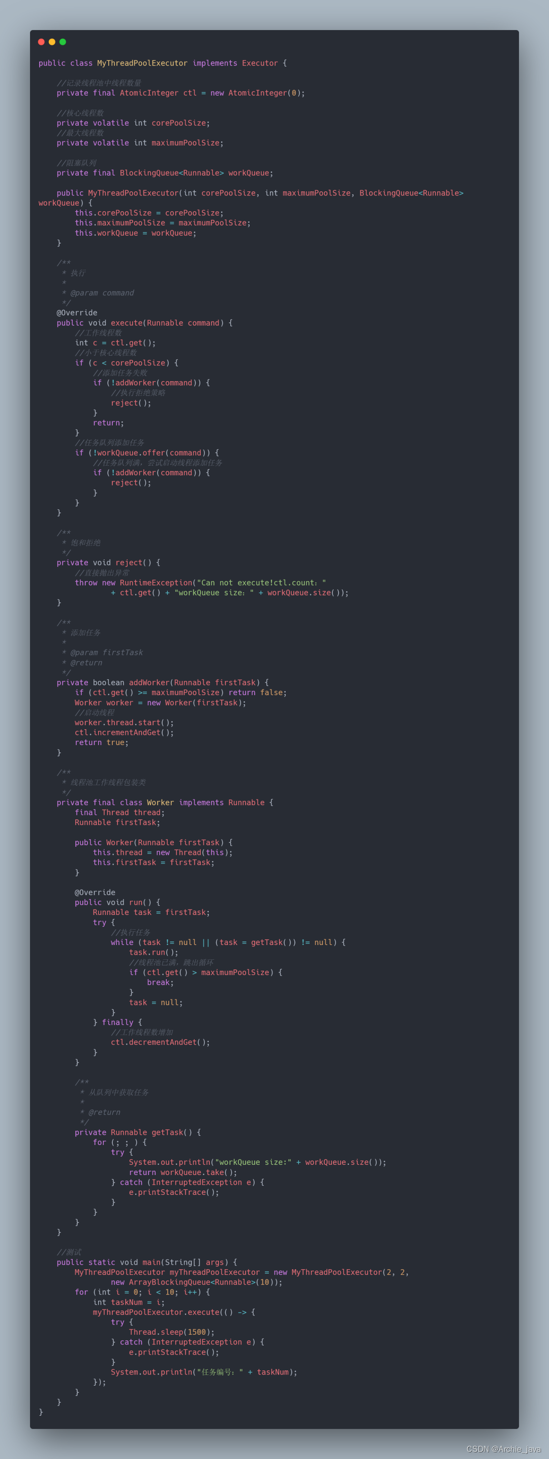 线程池实现原理可以查看 要是以前有人这么讲线程池,我早就该明白了! ,当然,我们自己实现, 只需要抓住线程池的核心流程-参考[6]: