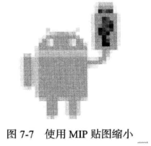 这个方式每个片段选择最近的纹理元素,当我们放大纹理时,他的锯齿效果看起来很明显,每个纹理单元都清楚的显示一个小方块,当我们缩小纹理时,因为没有足够的片段绘制所有的纹理单元,许多细节会被丢失,如下图: