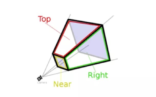 3、数据有了,要想把它显示出来,必须是被摄像机捕获到。这里可以理解成人眼,只有到了人的视野之内,人才可能是看到物体。如下图所图,摄像机会形成一个梯形空间,只有物体进到这个空间之中后,才能被识别。如果我们有1万个测试点数据,但是只有100个在这个空间之中,即只有这一百个会显示,其它的就可以不用显示了,因为即使显示了,也看不到。(如果视角变化了,看到其它的,那也是下一帧的事了。)