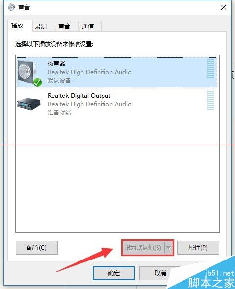 4、在声音模块功能,我们点击“扬声器”,再点击下边的“设为默认值”,最后点确定