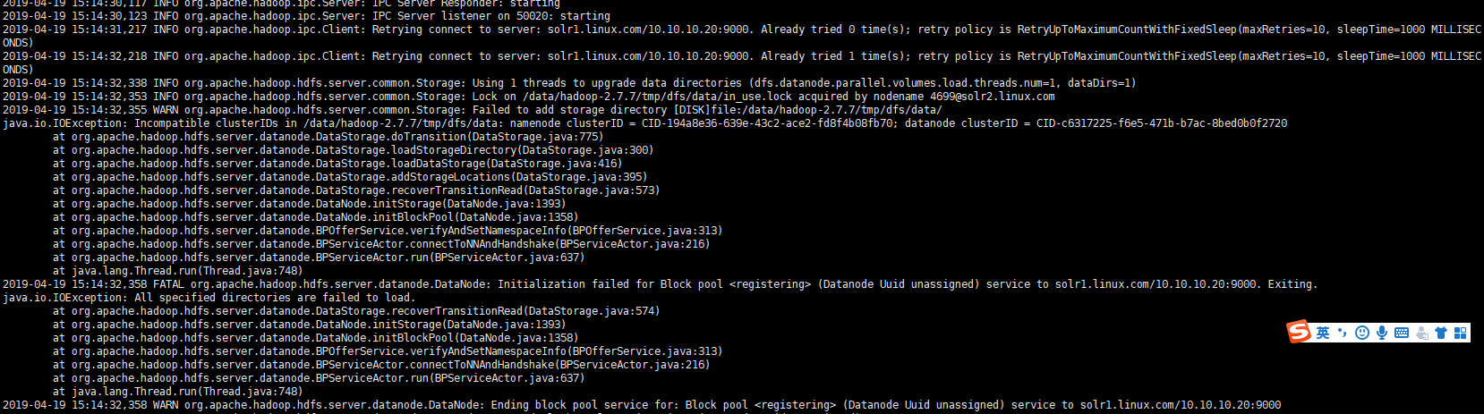 以上就是聪明小鸭子最近收集整理的关于java.io.IOException: Incompatible clusterIDs in /data/hadoop-2.7.7/tmp/dfs/data: namenode clusterID的全部内容,更多相关java.io.IOException:内容请搜索靠谱客的其他文章。