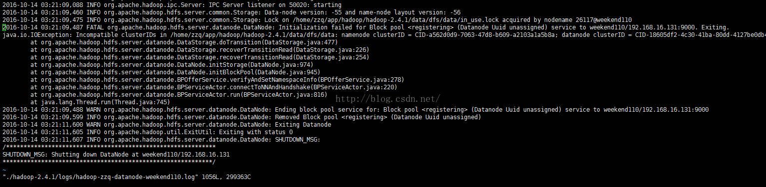 以上就是醉熏音响最近收集整理的关于start-dfs datanode没启动起来,异常java.io.IOException: Incompatible clusterIDs in的全部内容,更多相关start-dfs内容请搜索靠谱客的其他文章。