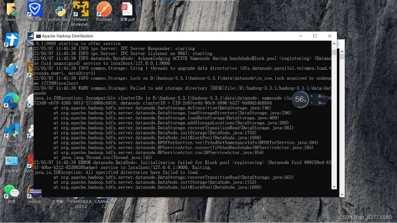 解决方案:将datanode文件夹清空,然后以管理员身份运行cmd,执行 hdfs namenode -format,再在hadoop的sbin目录下运行cmd执行.start-all.cmd 命令,启动Hadoop即可。