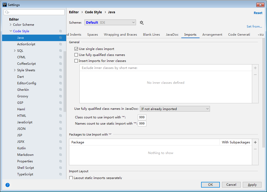 Class count to use import with '*' 设置为999(导入同一个包的类超过这个数值自动变为*)Names count to use static import with '*' 设置为999(静态导入同一个包的类超过这个数值自动变为*)