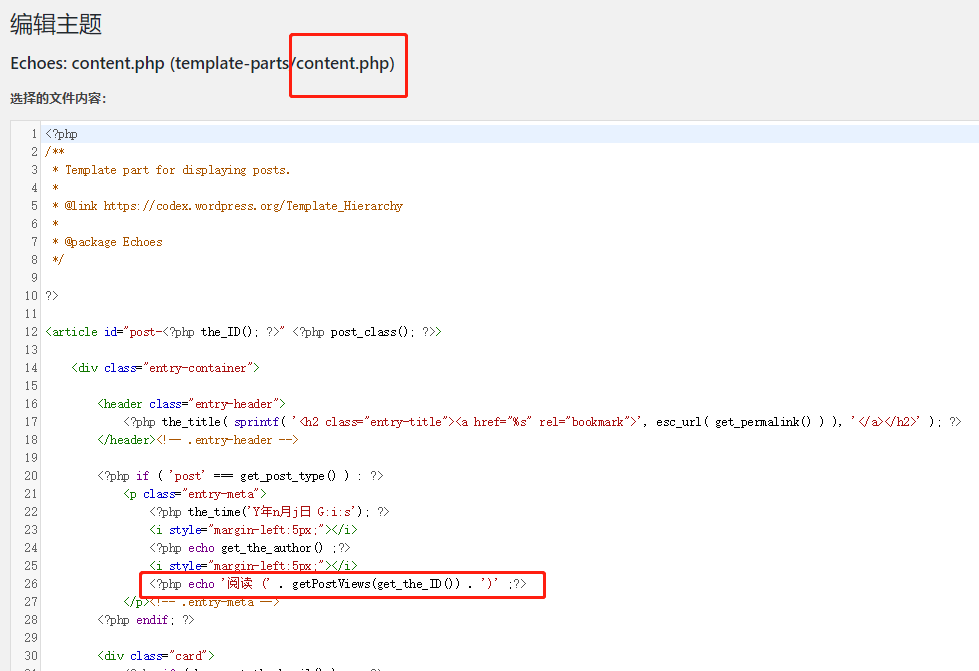 3. 将以下代码添加到要显示浏览次数的位置, 例如 文章列表(template-parts/content.php), 文章详情页面(template-parts/content-single.php), 搜索结果页面(template-parts/content-search.php)等。