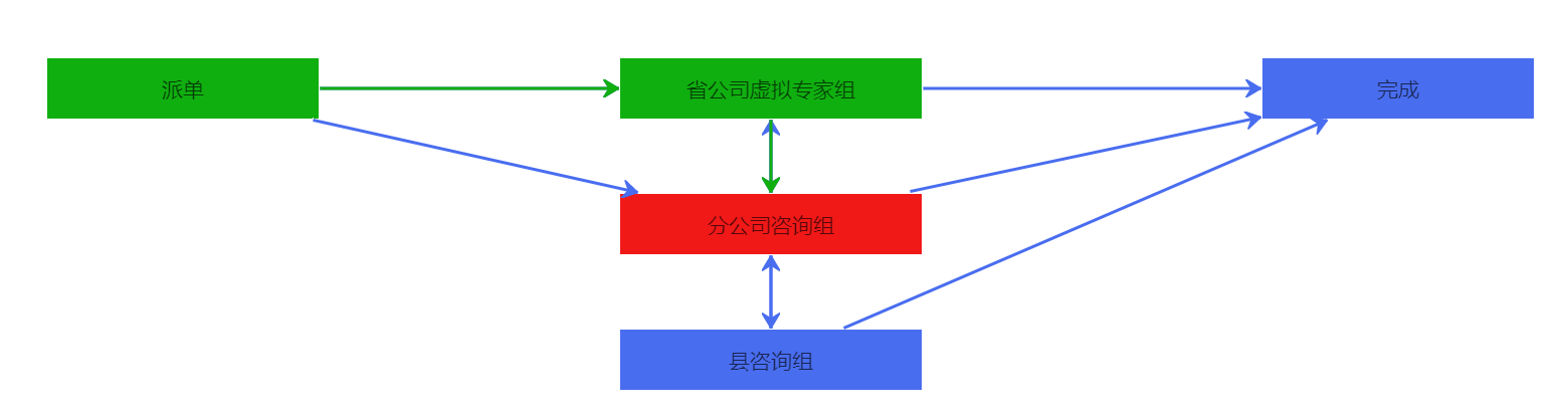 说明:在展示普通流程图的基础上,实现以下功能:在流程图中展示当前所在节点,并体现出其流转过程。上图中当前节点为分公司咨询组,流转过程为:派单->省公司虚拟专家组->分公司咨询组