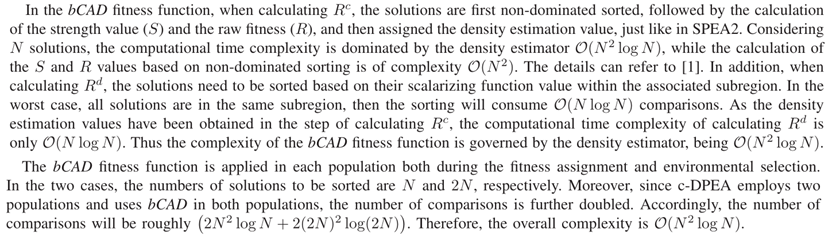 - 在本节中,分析了 c-DPEA 的计算时间复杂度。需要注意的是,c-DPEA 中的基本操作与 SPEA2 [1] 中的类似,即非支配排序(用于计算强度值和原始适应度)和密度估计操作。然而,与 SPEA2 相比,c-DPEA 需要在 bCAD 适应度函数中进行更多比较。此外,操作在两个排序过程中执行。此外,bCAD 适应度函数适用于 c-DPEA 中的两个群体。下面讨论细节。