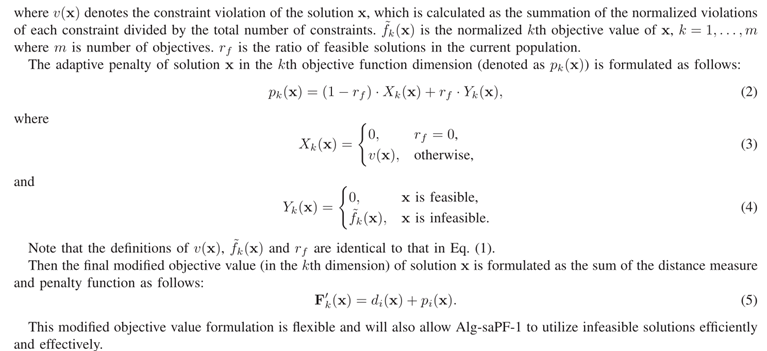 - Alg-saPf-1:它根据解的约束违反及其目标性能来修改不可行解的目标函数值。它有两个重要组成部分:距离度量和自适应惩罚,首先介绍它们以方便理解。