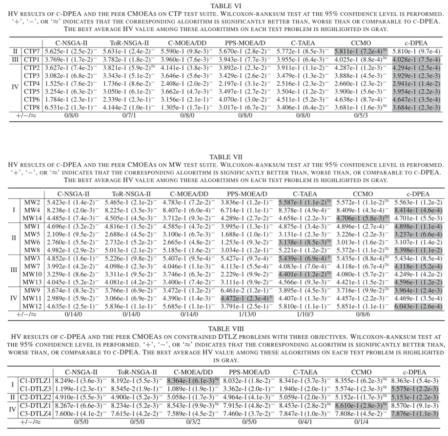 - 本节提供了 c-DPEA 获得的 HV 值与同行算法在 CTP、MW 和约束 DTLZ 问题上的比较结果。三个测试套件的结果分别总结在表 VI, 表VII和表 VIII 中。