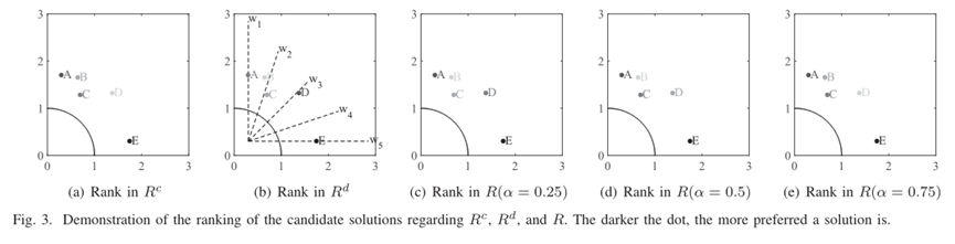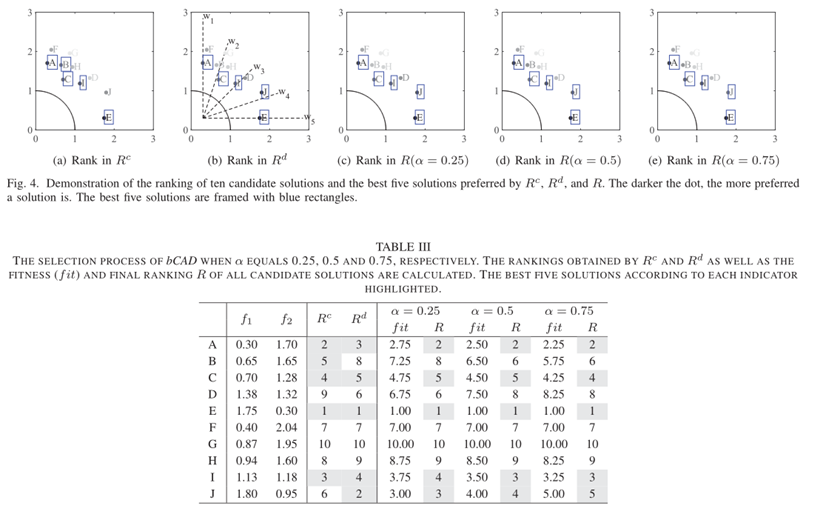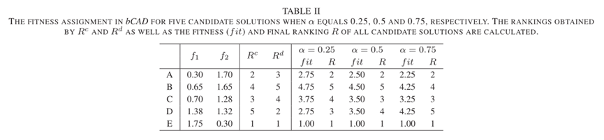 - 示例 ——为了说明使用 bCAD 对单个群体进行适应度分配的过程,我们提供了一个简单的示例来展示单个群体中的候选解决方案如何获得排名。为了简化问题,这里我们将单个种群的大小和权重向量的数量设置为五个。在此示例中,显示了根据 Rc、Rd 和 R 的候选解决方案的排名。请注意,在针对某个指标对解决方案进行排名时,如果两个解决方案在该指标方面具有相同的排名,则它们是随机排名的。
