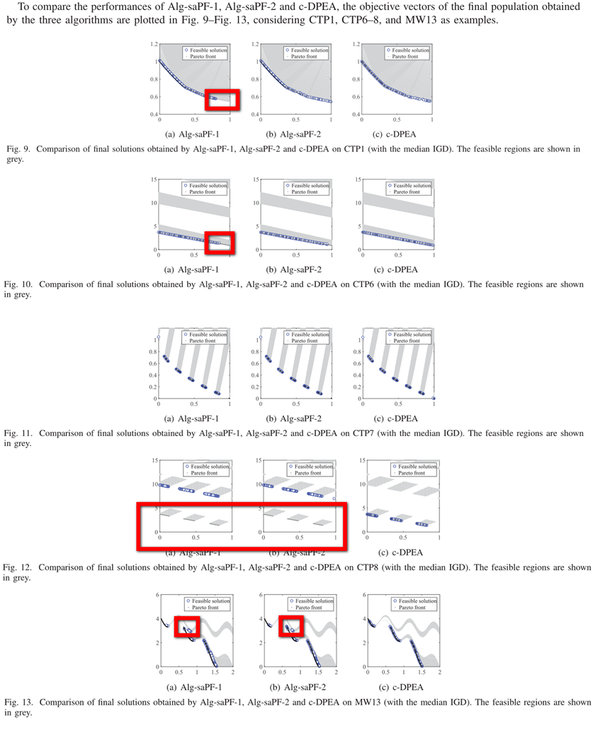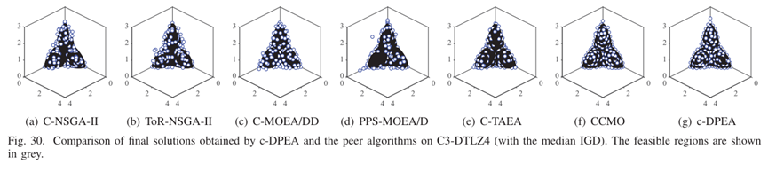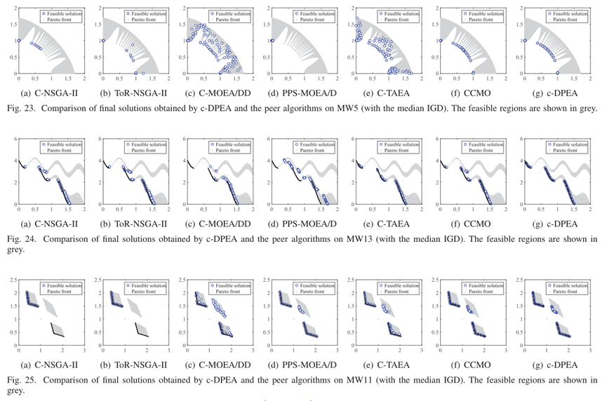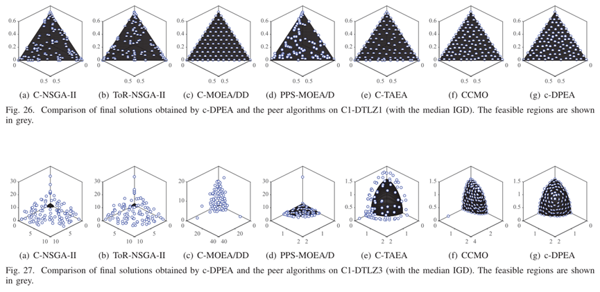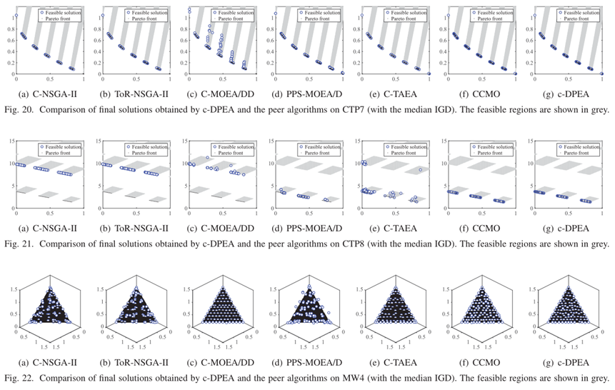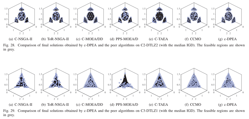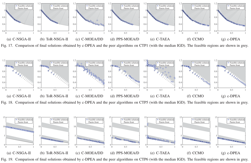 - 为了可视化结果,我们描绘了由C-DPEA和一些代表性CMOPS上获得的对等算法获得的最终解决方案,如图17-30所示