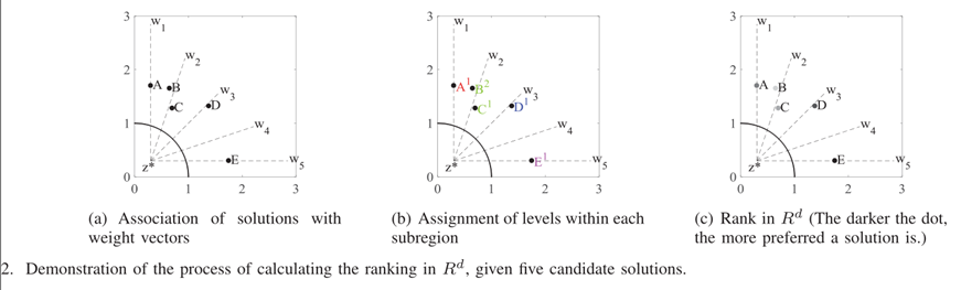 - 将所有候选解与不同的权重向量相关联,见图2(a)和表I中的第1-2列。在这种情况下,关联关系如下:A ∼ w1, B and C ∼ w2, D ∼ w3, E ∼ w5.