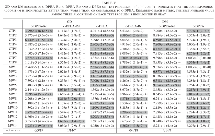 - 为了说明 bCAD 适应度函数的有效性,本节提供了 c-DPEA 及其仅使用 Rc 或 Rd 的变体获得的 GD 和 DM 值,即分别介绍了 c-DPEA-Rc 和 c-DPEA-Rd在论文的 V-D 部分。表 V 总结了 31 次独立运行的 GD 和 DM 结果(包括平均值和标准偏差)。Herein, the non-parametric Wilcoxon-ranksum two-sided comparison procedure [7] at the 95% confidence level is employed to examine whether the results are significantly different or not. The symbol ‘+’, ‘−’, or ‘≈’ means that the corresponding variant is better than, worse than, or comparable to c-DPEA.