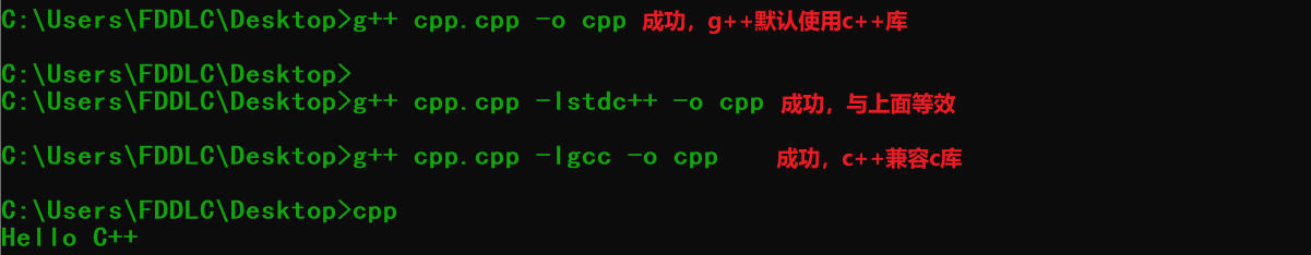 总结:只记报错的情况:gcc cpp.cpp [-lgcc](可有可无,该项为gcc的缺省值)。其他情况都是OK的。