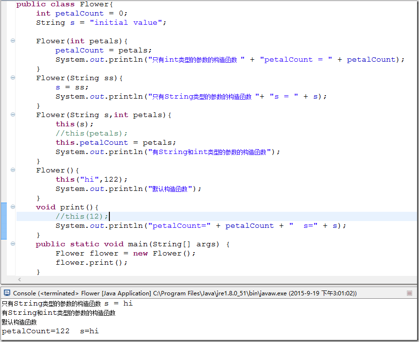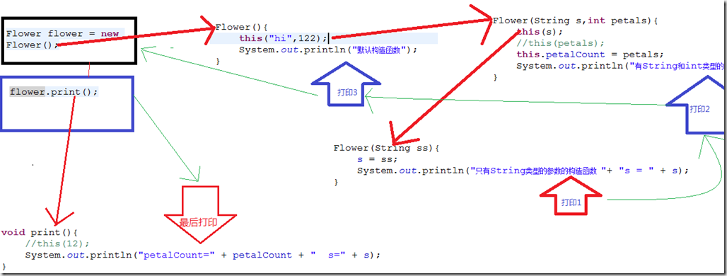仔细分析:从主函数开始,new Flower()会在内存分配空间,初始化对象,初始化对象是调用构造函数,这里没有写任何参数,当然是调用默认构造函数,就是那个无参的构函数。这个无参的构造函数的第一行代码就是this("hi",122);这里的意思是该无参构造函数又去调用带两个参数的构造函数,来到带两个参数的构造函数,第一行代码是this(s);这行代码自动匹配带一个参数的构造函数,发现Flower(String ss)这个比较匹配,都是String类型的参数。然后调用了带有一个String类型参数的构造函数,打印:只有String类型的参数的构造函数 s = hi;然后回到上一级调用函数,就是带有两个参数的构造函数,打印输出:有String和int类型的参数的构造函数;再回到上一级,就是无参构造函数,打印:默认构造函数。此时构造函数已经初始化完成新建的对象,最后在主函数的最后一行代码中打印:petalCount=122 s=hi。