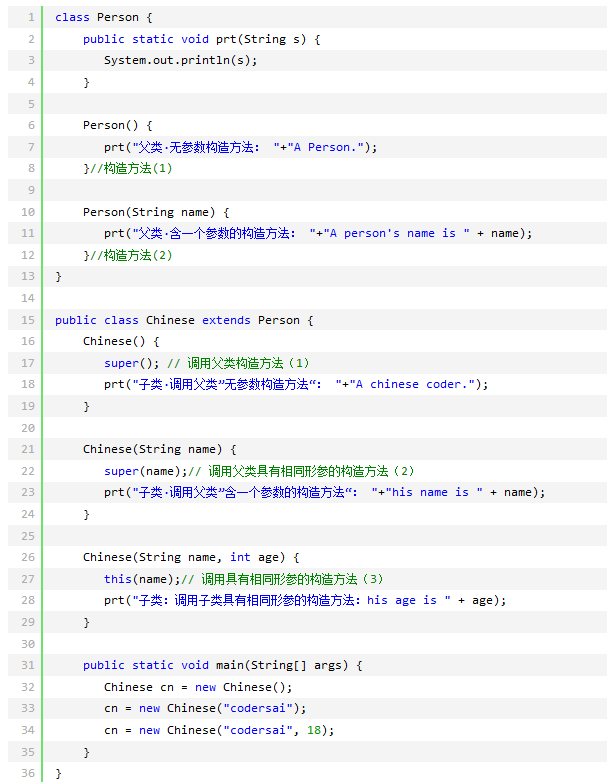 例子中Chinese类第三种构造方法调用的是本类中第二种构造方法,而第二种构造方法是调用父类的,因此也要先调用父类的构造方法,再调用本类中第二种,最后是重写第三种构造方法。