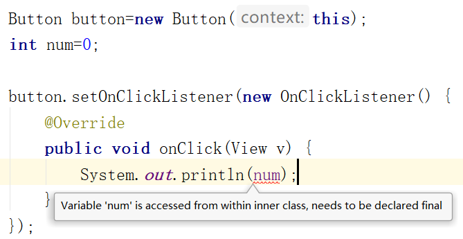 这时会出现错误提示,大概就是说你在内部类中引用的变量需要被声明为final常量。这时你只需要在定义num变量的"int num=0;"前面加上"final"的修饰符即可。(在AS中可以选中错误部分,用ALT+ENTER快捷键快速增加final修饰符)