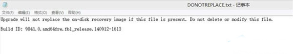 打开该文件夹,我们发现里面有一个名为“DONOTREPLACE”文本文件,告诉我们升级时不会覆盖这个“RecoveryImage”文件夹里面的恢复镜像,不要删除或修改此文件。除此之外,该文件夹里面还包含恢复介质以及关键驱动。
