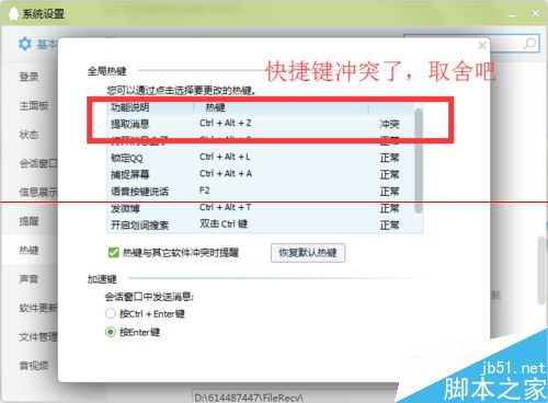 6、我们在为系统快捷截图定制快捷键不是随便哪个键都能设置的,要避免同其他软件(尤其是QQ、输入法)的快捷键组合发生冲突。例如,如果我选择ctrl+alt+Z组合就会跟QQ的快捷键组合发生冲突了,不能正常使用。