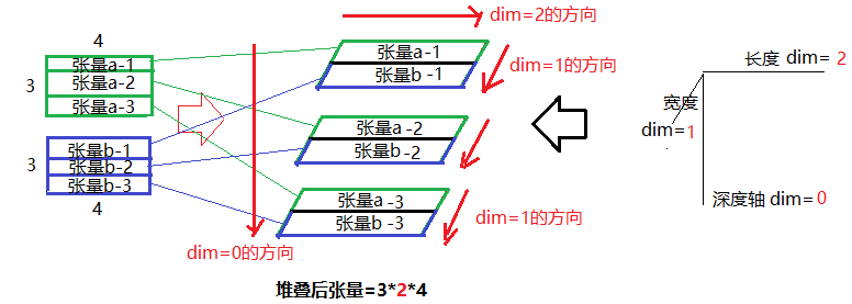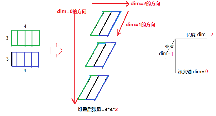 stack堆叠,可以增加一个维度,因此案例中dim=0,1,2 三种情形,在三种方向进行堆叠。