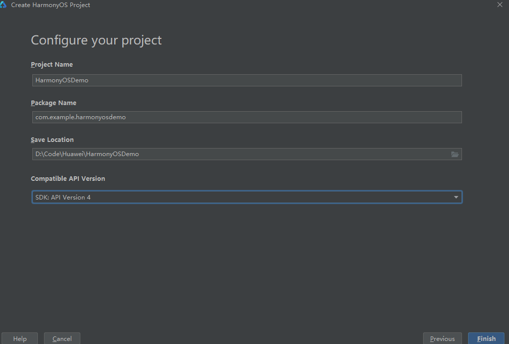 Project Name:项目名称(不能包含中文,只能使用字母、数字和下划线) Package Name:项目包名 Svae Location:代码保存位置 Compatible API Version:兼容API版本